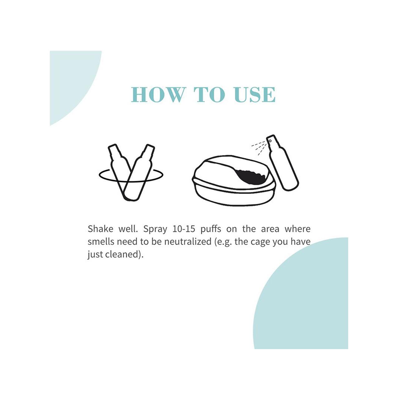Dacă se vrea deodorizarea mediului (litieră, cușcă, podea, zone de dormit), se pulverizează la o distanță de câțiva zeci de cm și se lasă să se usuce.