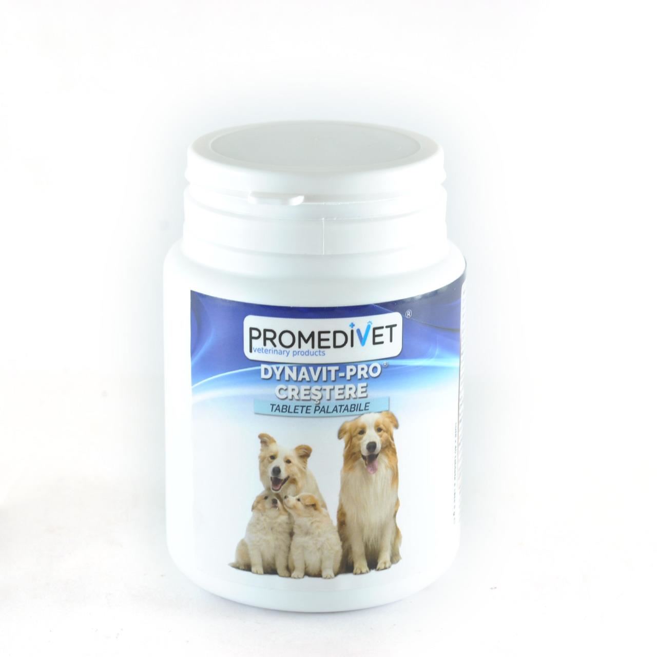 Dynavit-pro Crestere tablete palatabile, este un supliment nutritiv pentru caini. Contine o formula completa si echilibrata de vitamine si minerale, care impreuna ajuta la mentinerea sanatatii cainelui in perioada de crestere si/sau pentru femele gestante sau in lactatie. Ajuta la cresterea si mineralizarea sistemului osos. Adjuvant in prevenirea si tratarea fracturilor. Contine un raport Ca/P =2 pentru densitate corespunzatoare a osaturii. Contine un raport Ca/Mg =2 pentru absorbtie si utilizare corespunzatoare.