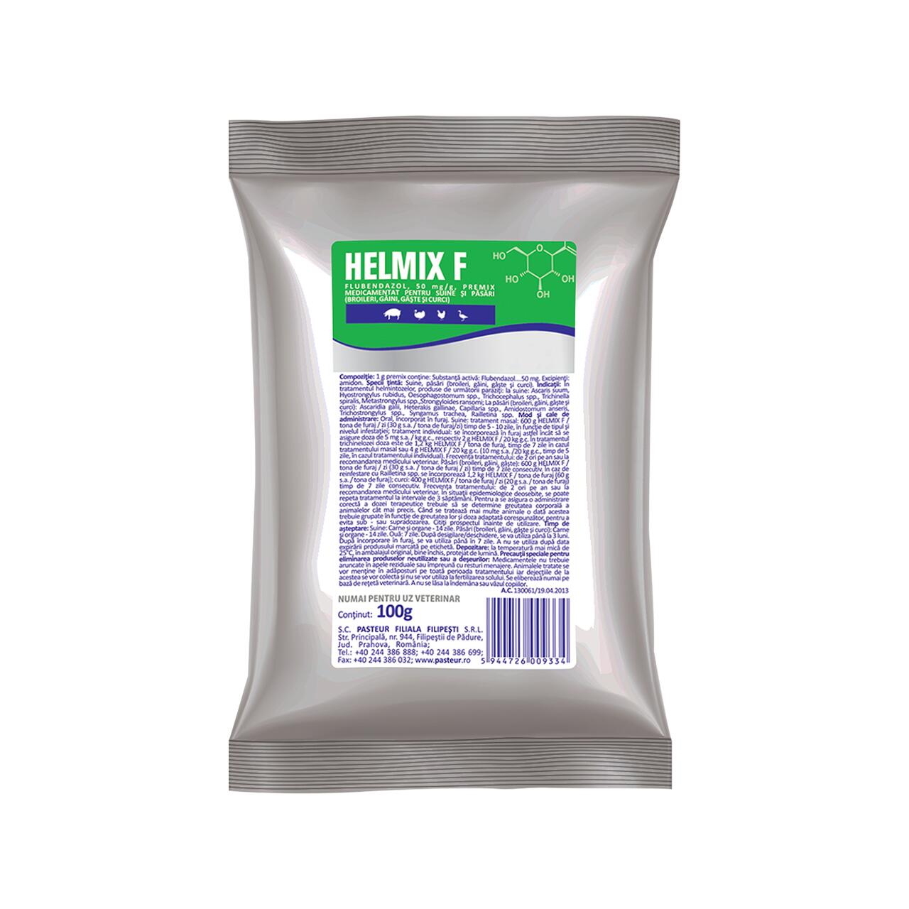 HELMIX F va fi bine omogenizat cu hrana. Se va efectua mai întâi un preamestec din cantitatea de pulbere prescrisă cu 5 kg hrană, se va amesteca bine și apoi se va adăuga restul de furaj până la 1 tonă și se va omogeniza de asemenea foarte bine. Pentru ca tratamentul să fie eficient este recomandat să se facă concomitent igienizarea spațiilor de creștere.