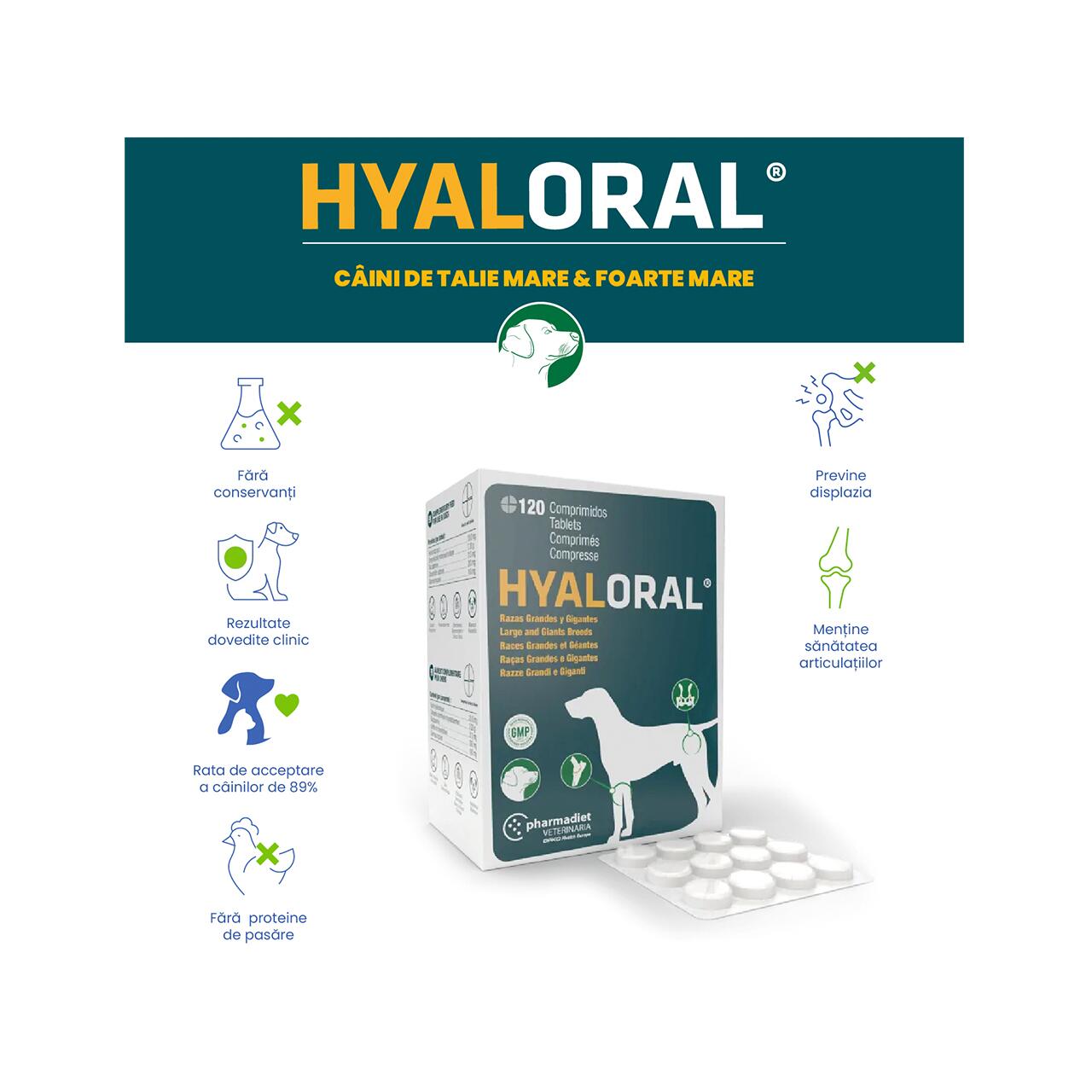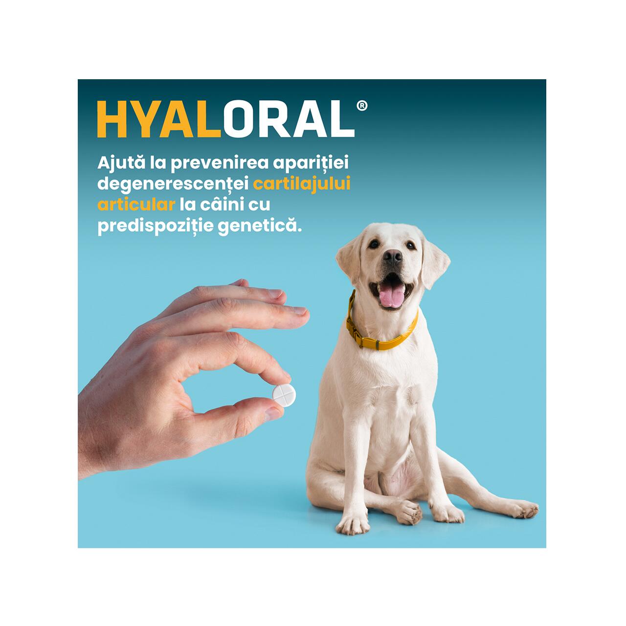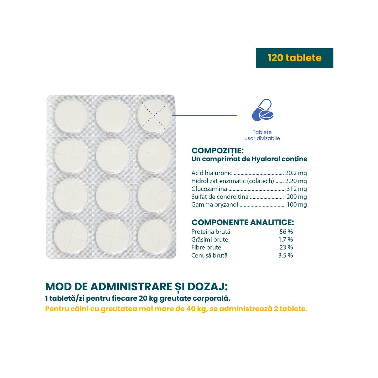 Pentru animalele cu greutatea mai mare de 40 kg, se administrează 2 tablete. Produsul se administrează ca atare sau încorporat în dieta obișnuită. Se recomandă încorporarea tabletelor de hyaloral în dieta zilnică, timp de cel puțin 3 luni. În funcție de necesități, efectuați 2 sau mai multe cure de tratament pe an. La animalele supraponderale se recomandă controlarea dietei pentru optimizarea procesului de recuperare funcțională. Se prezintă sub formă de tablete divizabile și apetente pentru o administrare ușoară și precisă în raport cu talia și greutatea animalului.