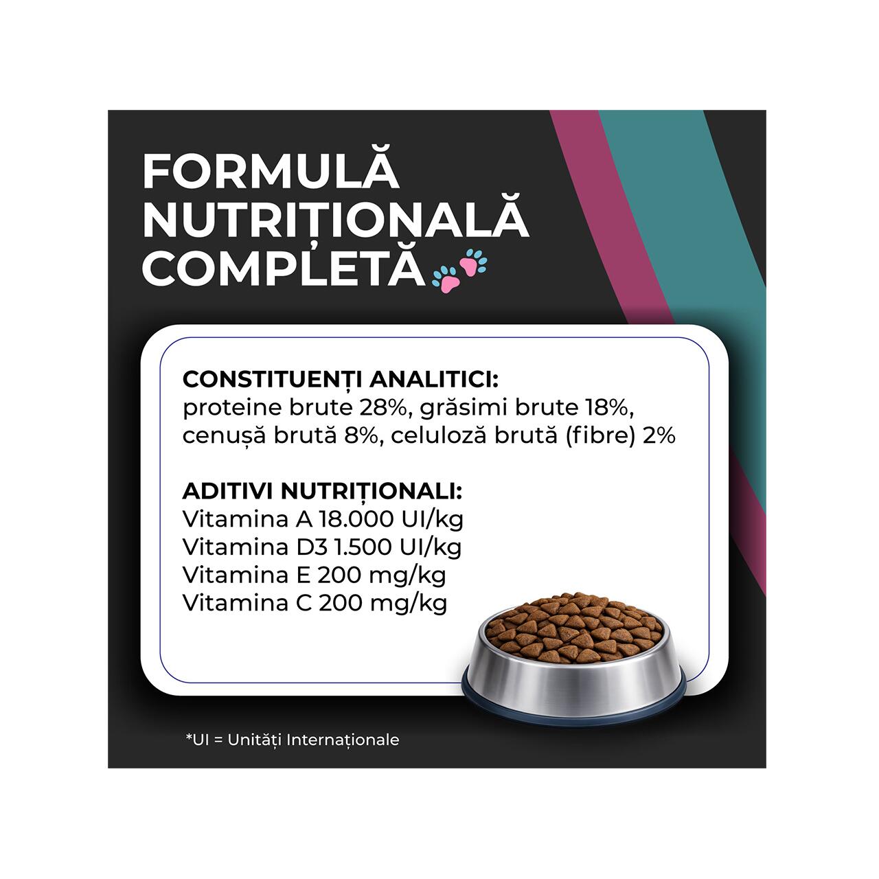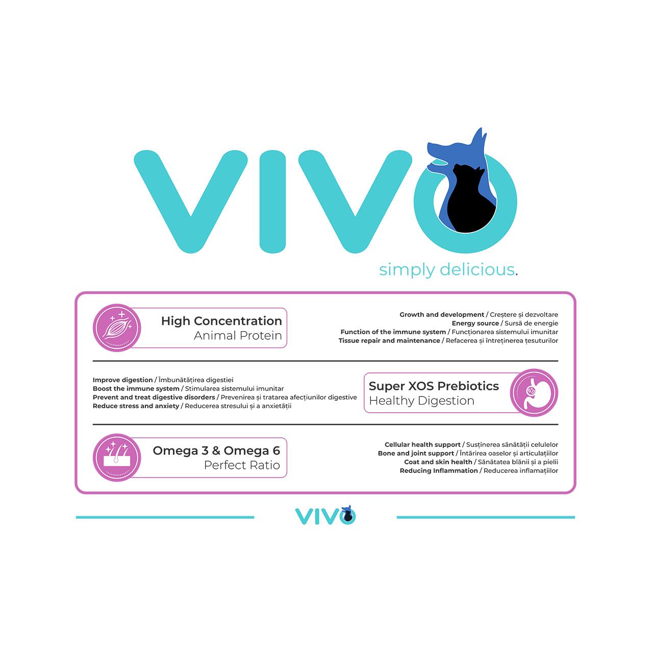 VIVO este o hrană super premium pentru animale de companie, formulată pentru susținerea funcțiilor fiziologice esențiale printr-un aport optim de nutrienți funcționali. Conținutul ridicat de proteină animală contribuie la creșterea și dezvoltarea normală, asigură sursa principală de energie metabolică și susține procesele de refacere și menținere a țesuturilor. Proteinele joacă un rol esențial în funcționarea adecvată a sistemului imunitar.