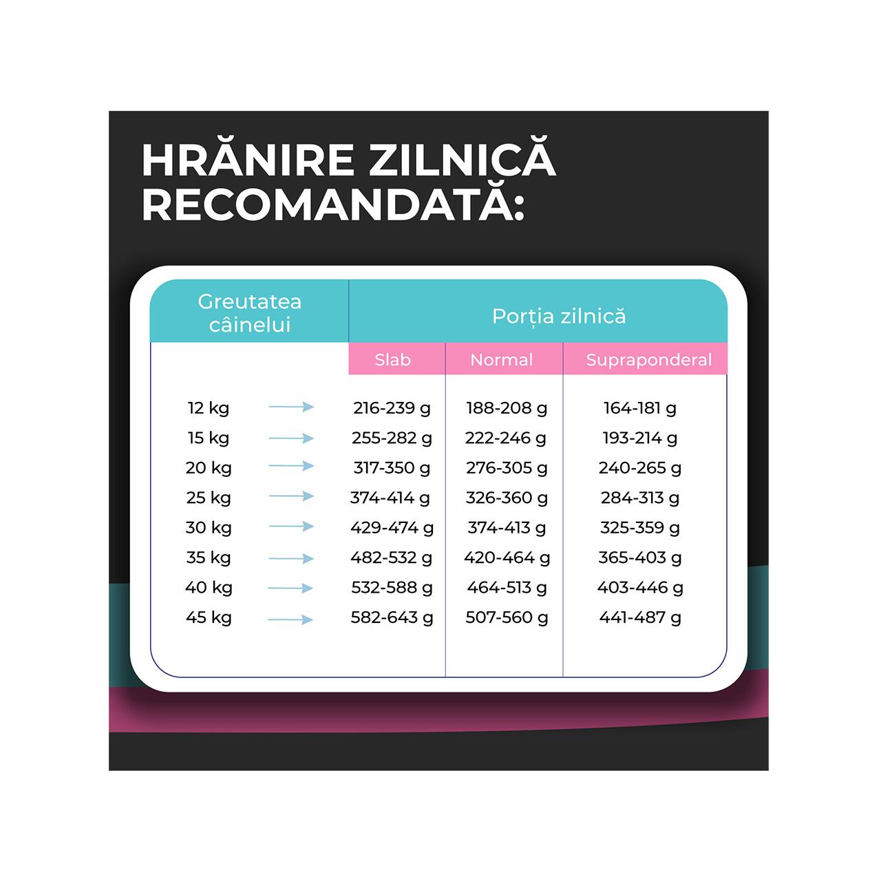 Consultați tabelul de hrănire pentru cantitatea zilnică recomandată (în grame/zi), în funcție de greutatea câinelui (kg) și de condiția fizică (slab, normal sau supraponderal).